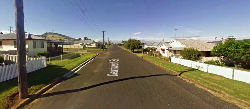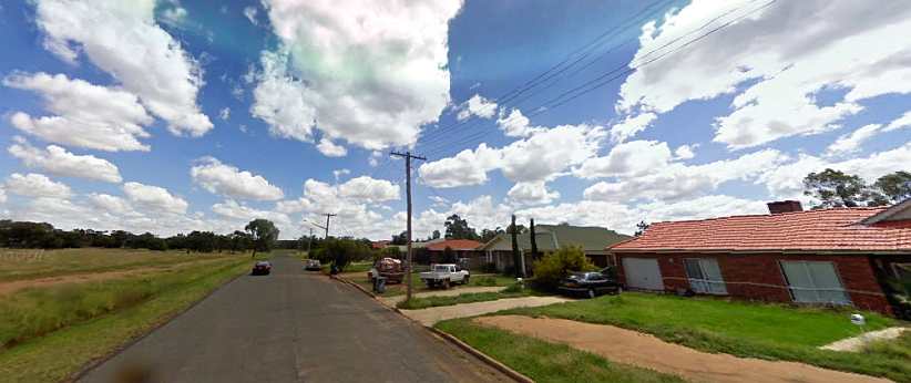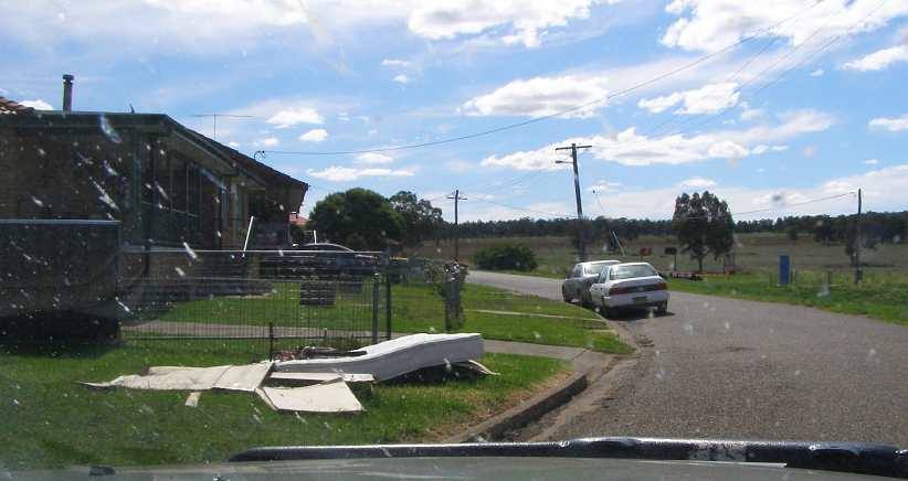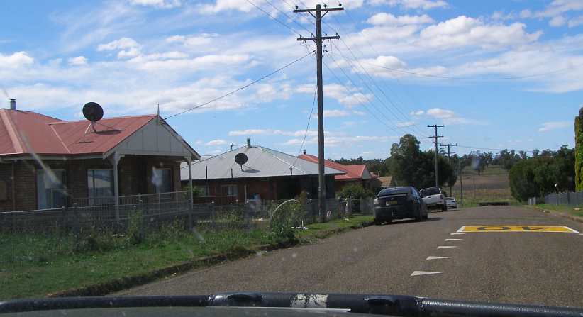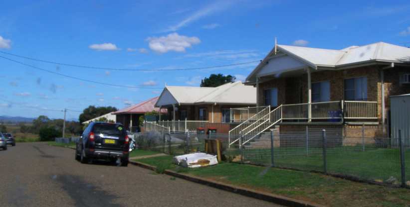 Typical Werris Creek street. Homes on a hillside with most of them between fifty and a hundred years old, most locals keep them neat and lawns well-watered.