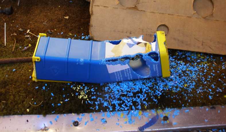 …and completed the dismemberment with my trusty cordless angle grinder. Without the rails the mechanical parts sitting in the ground sure looked lonely.