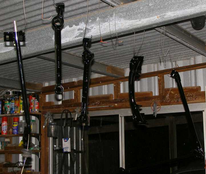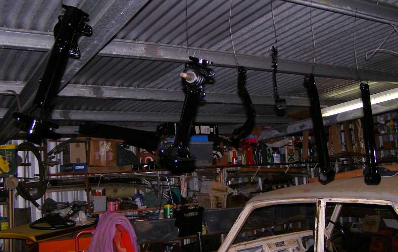 Lotus Cortina parts. Hanging up for the paint to dry, left to right are a pair of struts, brake and clutch pedal and lower rear trailing arms.