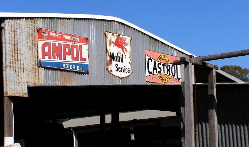 Signs and rust. Rusty corrugated roofing is in vogue in many places these days, here it’s just a part of a backdrop. The signs from Ampol, Mobil and Castrol were commonplace in the fifties.