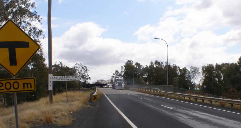 Bridge to Gilgandra. The T-intersection after this bridge makes for noisy truck braking, gearchanges and acceleration. To the right is the centre of town, to the left the traffic stays on the Newell Highway, the main road between Queensland and Victoria.