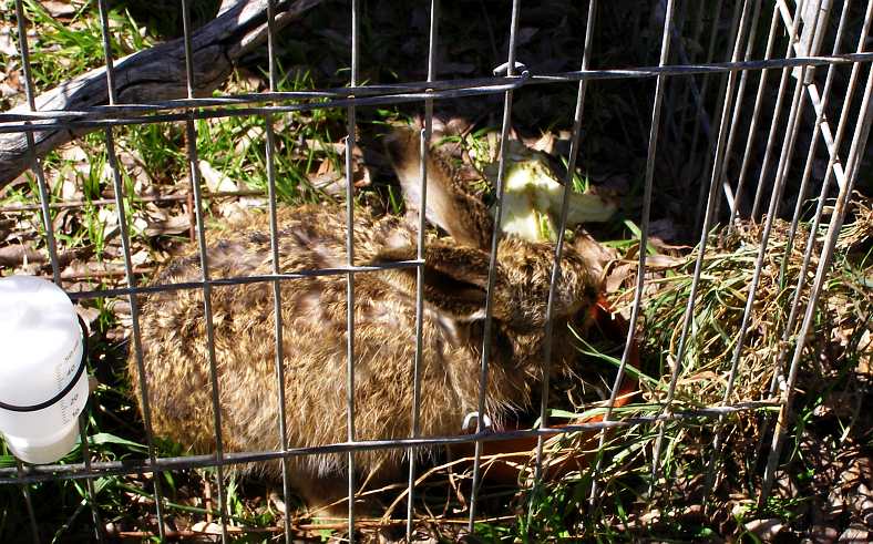 Rescued rabbit. Found cowering and shaking, possibly having been chased by their dogs, this rabbit was caged and cared for until it was ready to be taken somewhere for release.