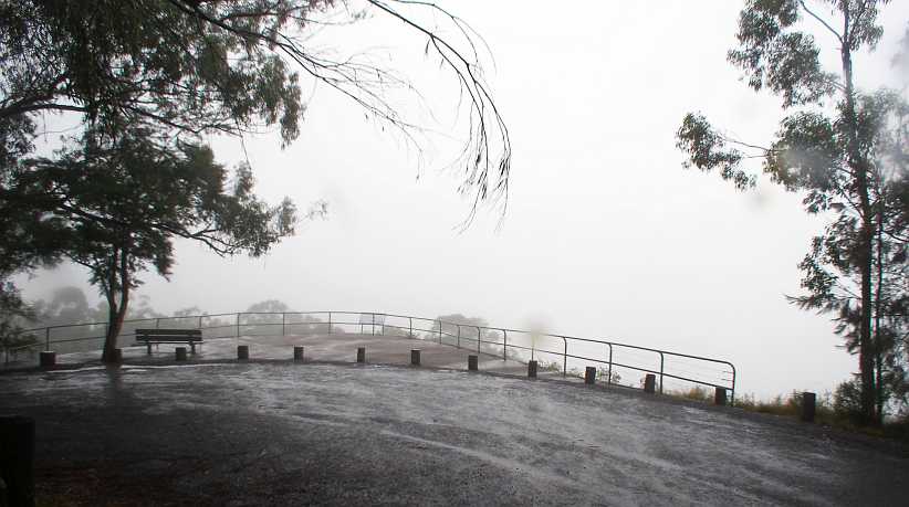 I got all of that done before dark and the next morning I was off early for the drive to Grafton. Even in the inclement weather – with fog – I still stopped in at the Raspberry lookout for a cup of coffee. The view, however, was not up to the usual standard: