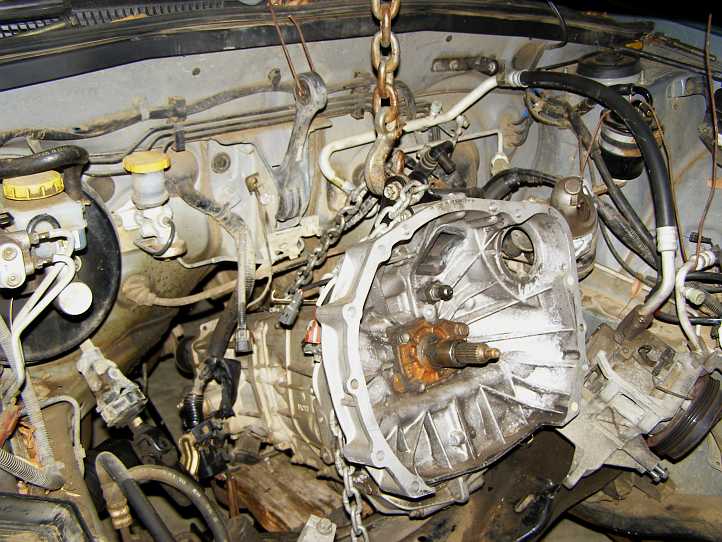 Craned in. My engine hoist does its stuff here as the gearbox is lowered into its space.