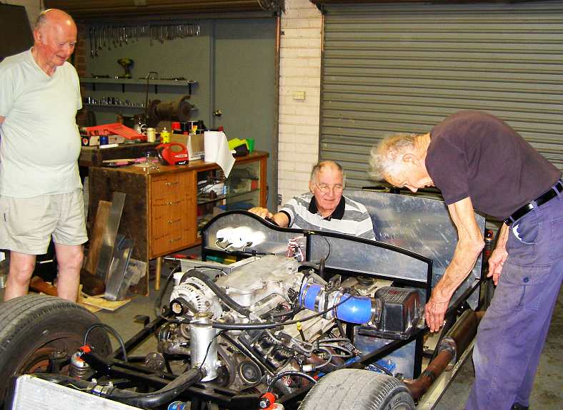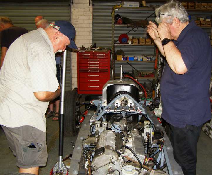 Maserati progress. Unlike the other car fitted with the Holden/Buick V6, this car had plenty of space within the bodywork to fit the engine. Bob works on the air cleaner while Bob Winley sits in the car and Ray Eldershaw looks on.