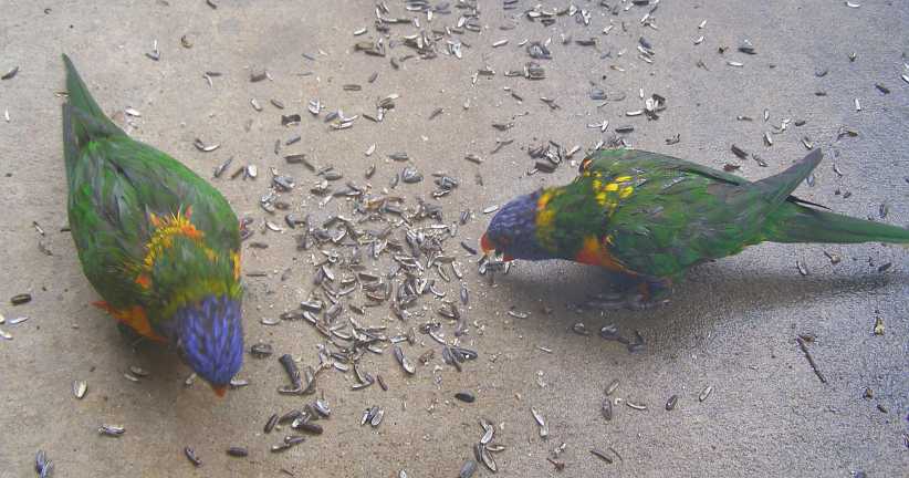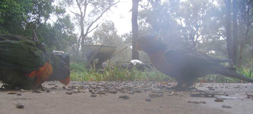 Birds at ground level. I tried sitting the camera on the concrete apron in front of the workshop to get a close-up of the birds eating the seed Bob spreads for them.