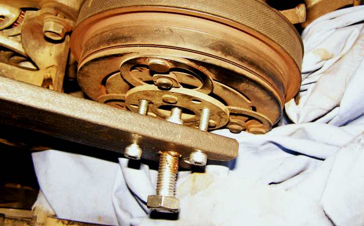Cool tool. This puller relies on pressure applied to a cap screw loosely fitted into the shaft, the other screws are fitted into the threads provided and so it’s easy to remove the clutch. The tool also doubles as a means of assisting the tightening of the pulley when the job’s done.