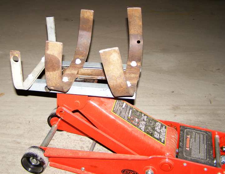 Looking forward to the job of actually lifting in the gearbox, which I still didn’t have, I once again used the cradle I’d made for the same purpose on my floor jack. But now I had a bigger jack and the swivel at the tip of it was very securely screwed on, so I duplicated the detail of this on a piece of steel plate and worked from there to produce this: