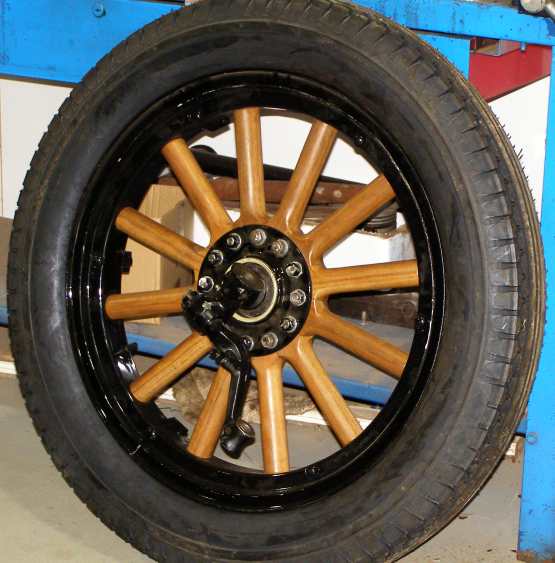 Wooden wheels. Freshly restored, this wheel has part of the steering assembly attached.