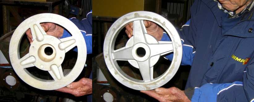 Having recently become aware that Bob made a later type of wheel than I’d previously noticed, he took me into his shed where all the patterns are kept. This wheel is of the type with an alloy casting with an outer flange to which two rim sections are sealed and bolted in place.