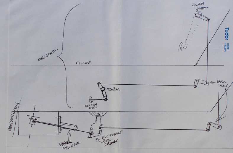 The old-style pull-rod and Z-bar clutch mechanism was going to have to go by the wayside. The new gearbox had a hydraulic system and there was no other way to do this than to go with the hydraulics. I drew up a diagram: