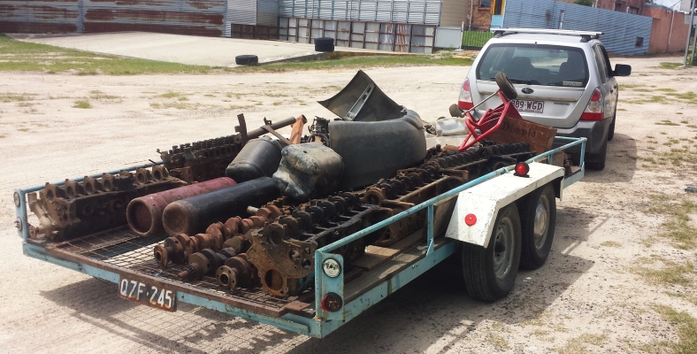 Moving loads. Over a few weeks I spent days at a time at the shed getting stuff moved. This trailer load holds about six Hemi 6 blocks, a few heads, several crankshafts, oxy-acetylene bottles and other assorted items.