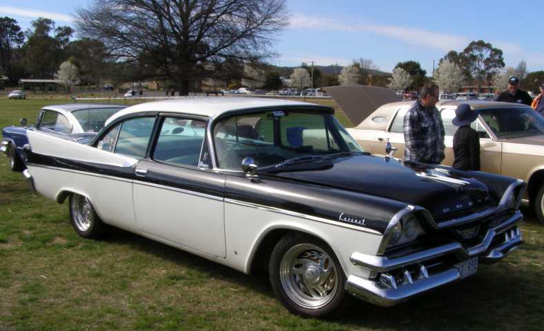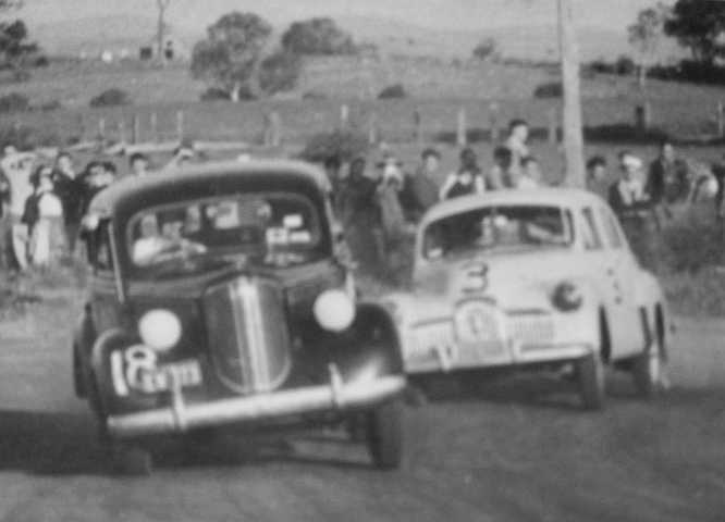 Don Gibson and his Dodge. Gibson was famed for his spectacular driving of this very much out of date car at New South Wales circuits in the 1950s. Here he leads Dick Shaw’s Holden.