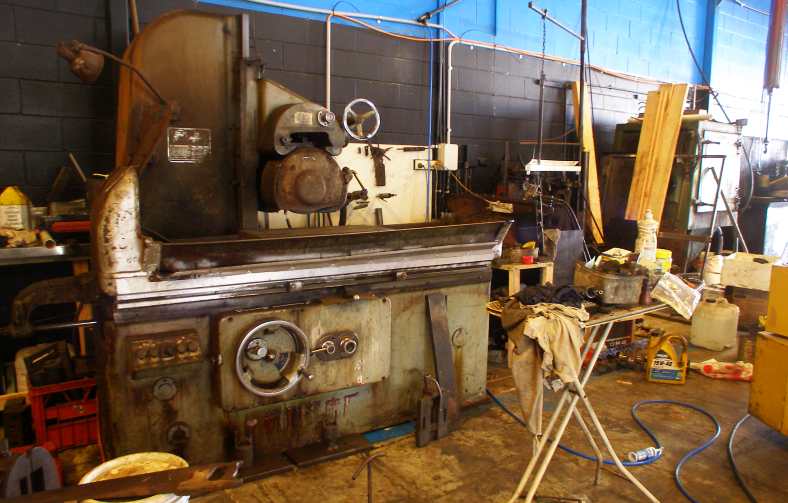 Head grinder. Nothing new about some of the machinery he uses, this grinder does a great job of surface-grinding cylinder heads, blocks and also flywheels. Beside it is the parts wash, while the ever-practical Ben has found that having some old ironing boards around enables him to set up small benches anywhere according to his needs.
