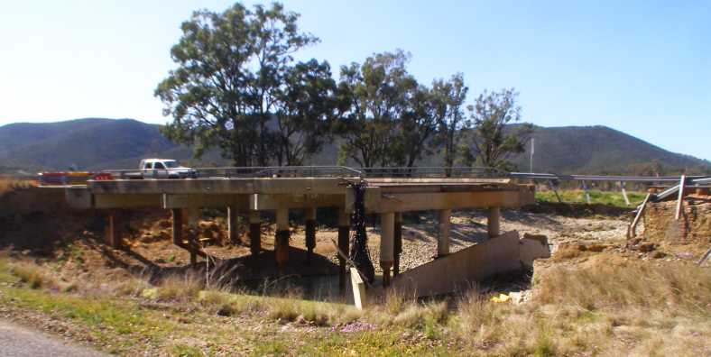 Flooded again. I don’t have any idea how the utility got onto the part of the bridge which remained, it had some front end damage, but it surely hadn’t jumped the 5 metres where there was no road! The washaway was caused by heavy rains upstream along the river coming down and washing up the creek, not floodwaters coming down the creek.