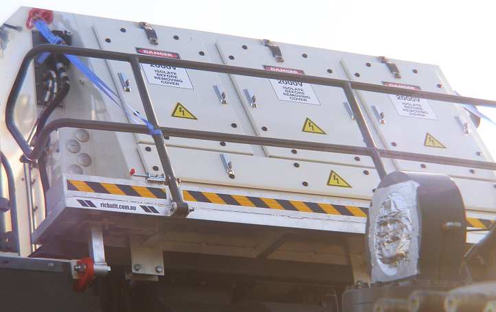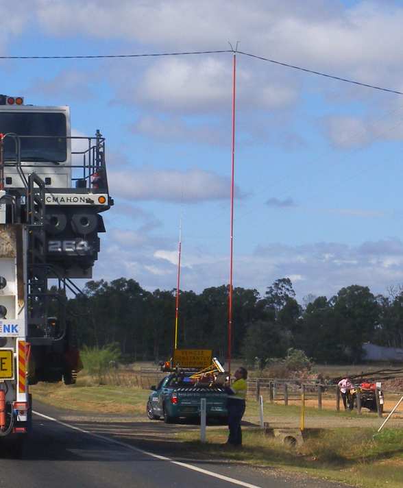 Crossing the railway line at Dingo, with minimal clearance to the overhead power lines…