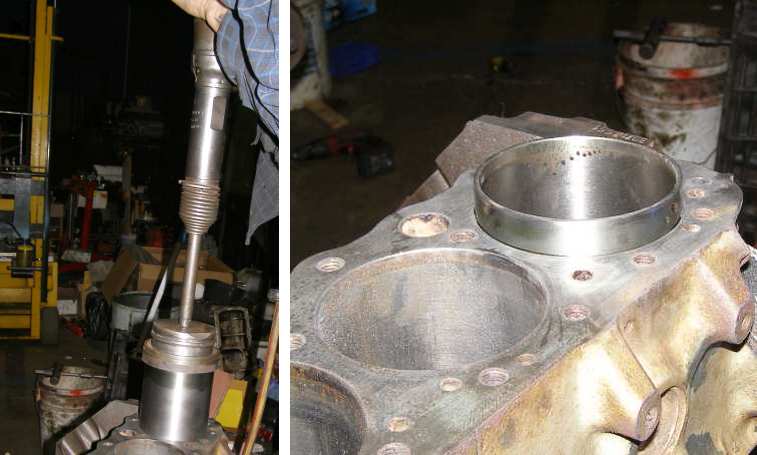 Sleeving a block. Having bored the block to suit, the liner is pounded down into place (left) with a pneumatic hammering device. Ultimately the surplus would be cut off when the block was decked (right).