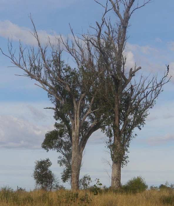 Back from the dead. These trees look way too solid to have such small clusters of leaves coming from their trunks and major limbs, but were among the many which showed the marvellous natural recovery method of the eucalypts.