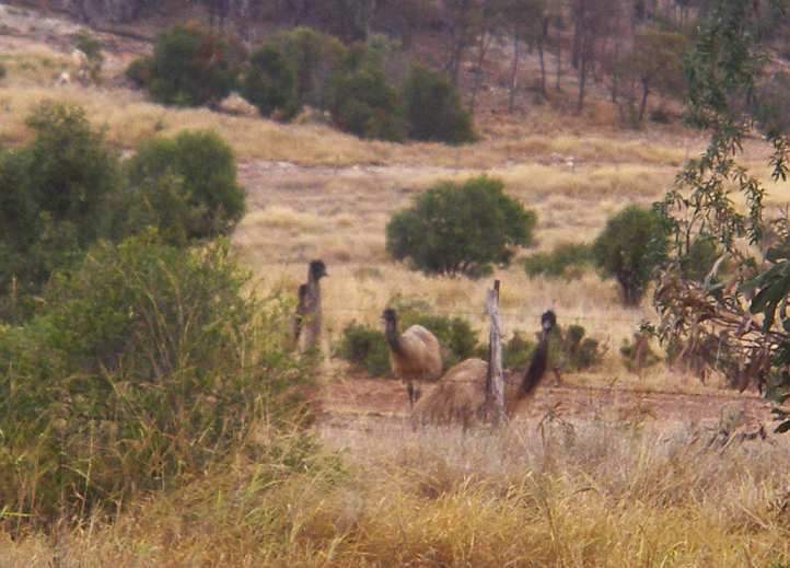 Emus on the watch. Four emus watch us drive by. They’re behind a fence, if threatened they would soon be running towards that hill in the background.
