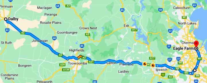 We only had 320kms to go and there was the complication that we had to book a police escort for our drive through Dalby. Dulacca to Dalby would take us about three hours with a stop at Miles for fuel, so that was organised and dictated the time at which we’d be on our way in the morning.