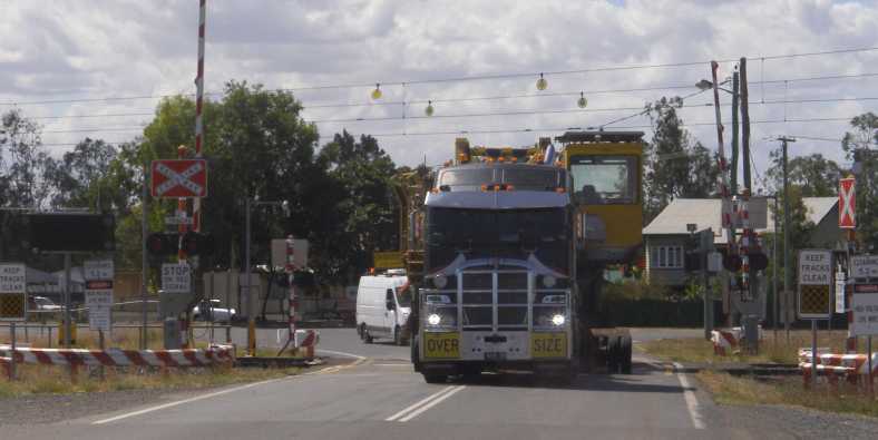 This road, however, is not quite the highway standard and normally not used by wide loads. And it adds the complication of having to cross the railway where there are overhead wires to power the trains, something which isn’t present at the level crossing at Emerald.