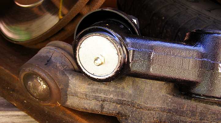 Grease nipple fitted. On the advice of a friend with Ford experience I fitted a grease nipple to enable me to keep it in service longer. This is the left side lower control arm, which I fitted in the driveway at home.
