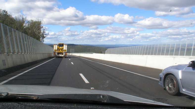 He was describing exactly the situation which had existed on the other road and we set out towards it with trepidation, the wheels on the platform were set at 4.2 metres wide, a call to the road workers revealed that they had left 4.4 metres of bitumen. Our driver, Darren, reckoned he could drive on it, but soon learned that the edges were falling away as he did.