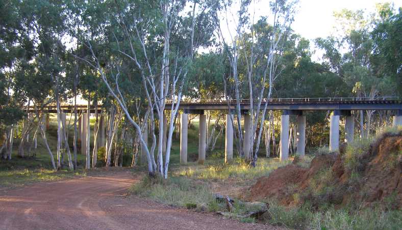 Tight squeeze. A diversion caused by a low railway bridge sent us on this track beside the creek at Alpha. The corners were nearly too tight for our long load.