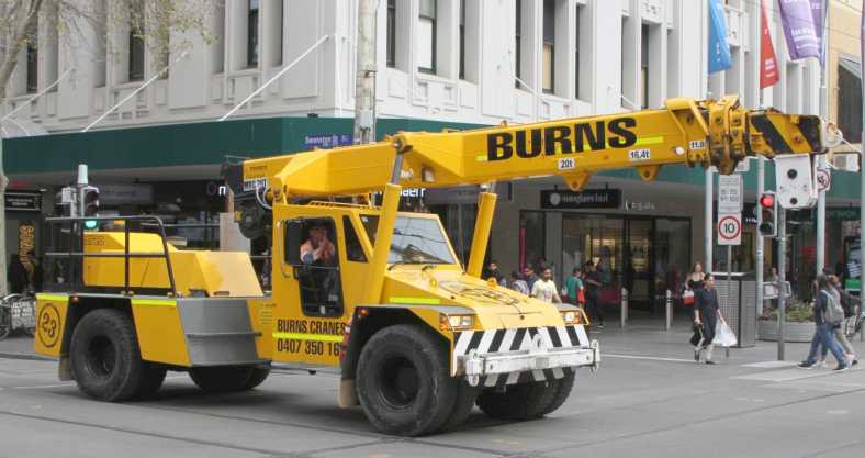 A Franna crane. They steer by bending in the middle, they have no suspension and bounce all over the road, dangerous and uncomfortable things.