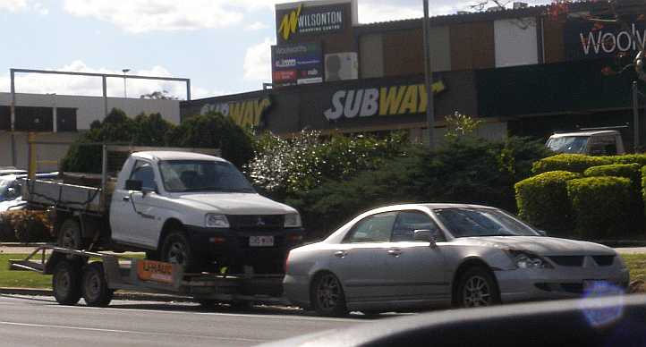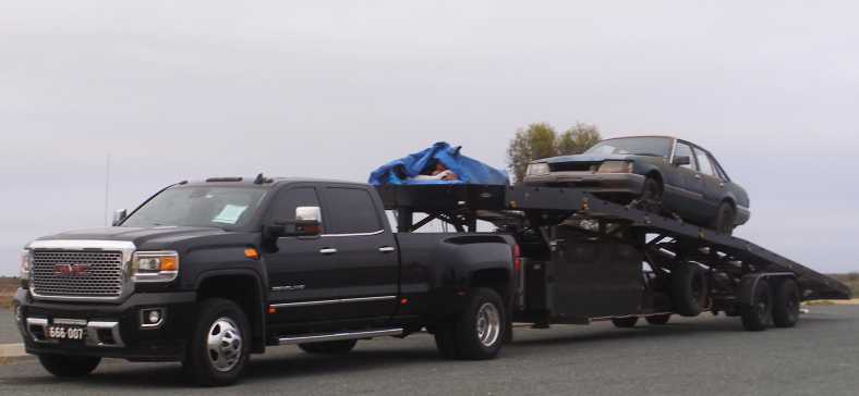 Rare sight. Modern Chev pickups are rare enough in Australia, US-style car trailers attached to them even more rare. I would think this one is probably the only one in the country.
