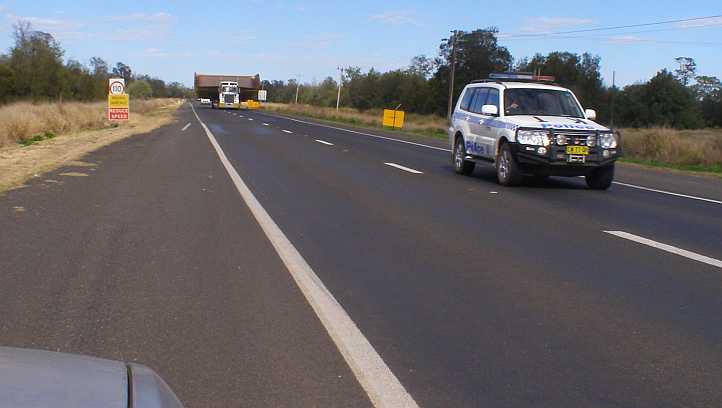 Police at Dalby. Loads of this size can only proceed through Dalby with a police escort, here the details are checked by the officer involved and soon the load would be on the move again.