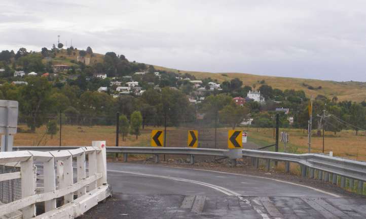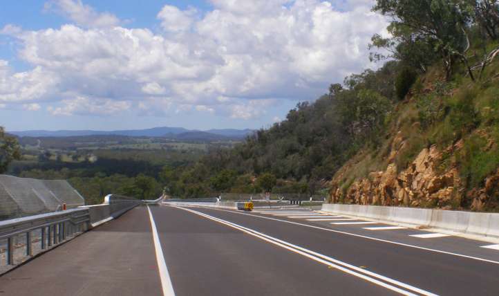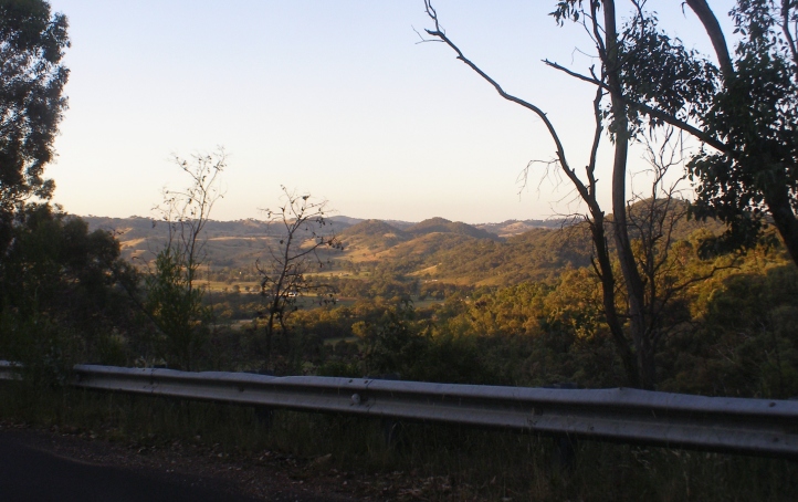 Scenery. Dropping onto this descent on the Leichhardt Highway shows how the country in the distance has come from volcanic beginnings. It also shows some optimism about drivers slowing because the guardrail might have taken a hit.