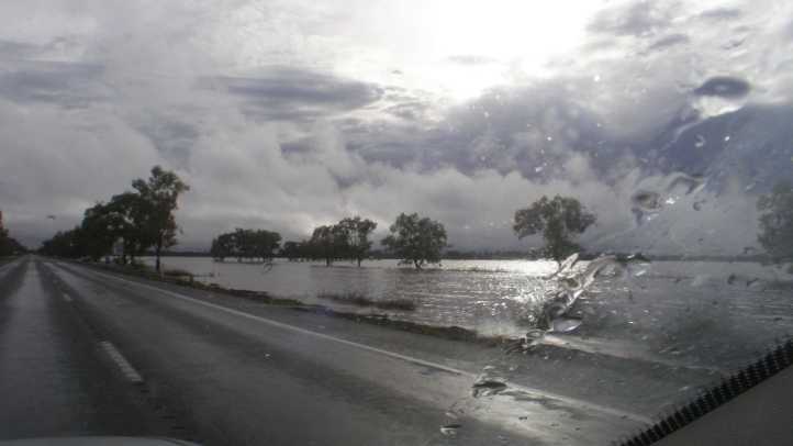 Signs of a wet season. Water along the road as I drove away from the farm indicated that the rain we’d seen lately in other places was widespread.