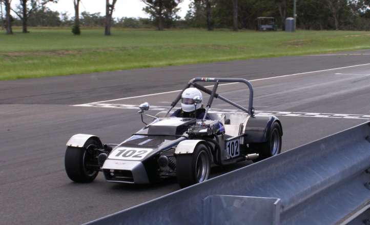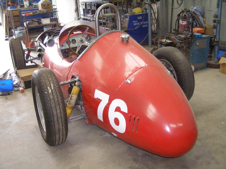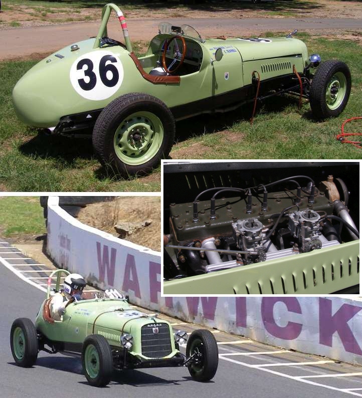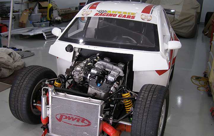 Aussie racer. A large water-cooled motorcycle power unit nestles in the front of the car, drive is to the rear wheels.