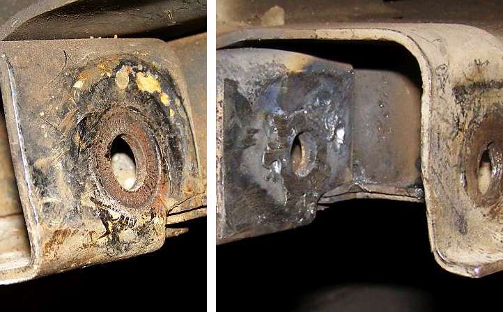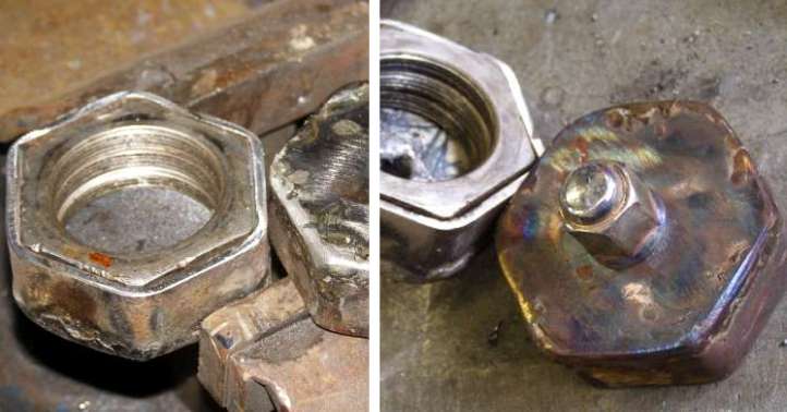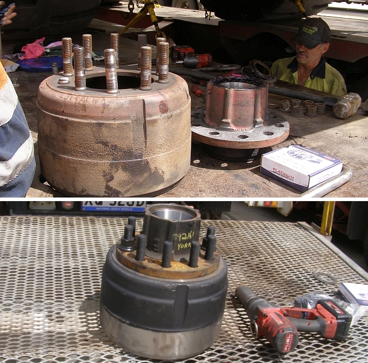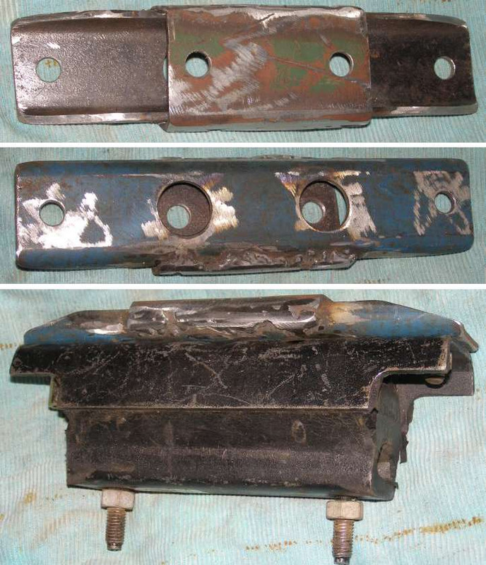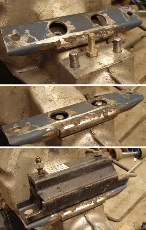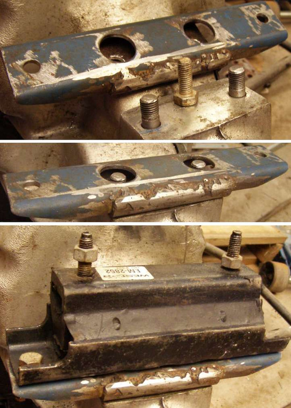 Step by step. The bolt holes were enlarged from the original size, as shown by the old bolt, the threads cut and the studs screwed in, then ground down to the required height with the angle grinder. I’d used the hole saw to cut the holes for the insertion of the nuts, but couldn’t go big enough for the usual 19mm nuts. Fortunately those differential flanges had a similar problem and 17mm hex nuts were to be found. The lower pic shows the gearbox mount bolted in place, all of this on the gearbox while turned upside down.