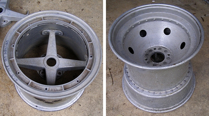 Rennmax wheels. Wheel solutions: The quest to make a lightweight yet wide wheel has resulted in many answers. On the right is the complex ‘monocoque’ answer Bob created in the late sixties, with aluminium spinnings rivetted together and bolted to a small centre casting, on the left is his ‘composite’ answer of the early seventies, which has no wellbase and therefore requires the outer rim section to be unbolted to change tyres.