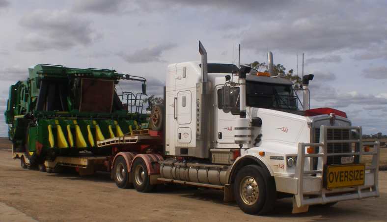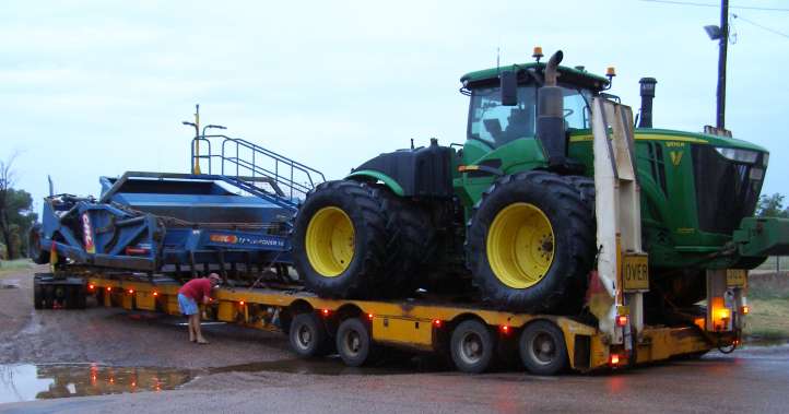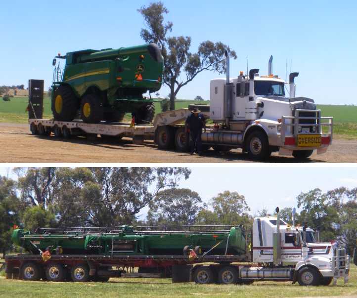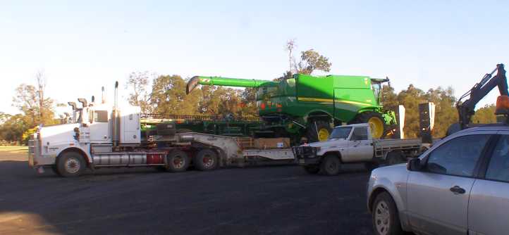 Late arrival. It was late in the day when the header arrived at the farm, delays unloading caused further lateness.