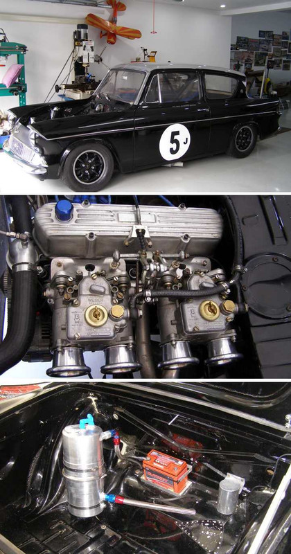 Anglia. When Phil went racing in his Anglia in the late sixties it was powered by a twin-cam engine, but this car has a pushrod engine with the rare ‘Howard’ downdraught head created by Geoff Smedley. Simplicity is one of the keynotes of its very neat construction.