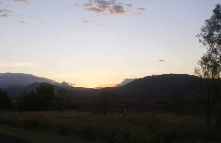 Through Emerald I went to the tyre service and got a replacement tyre, then it was back by the same route to Roma. The day was getting away as I headed towards the Carnarvon Range, where the lowering sun was combining with the cloud cover…