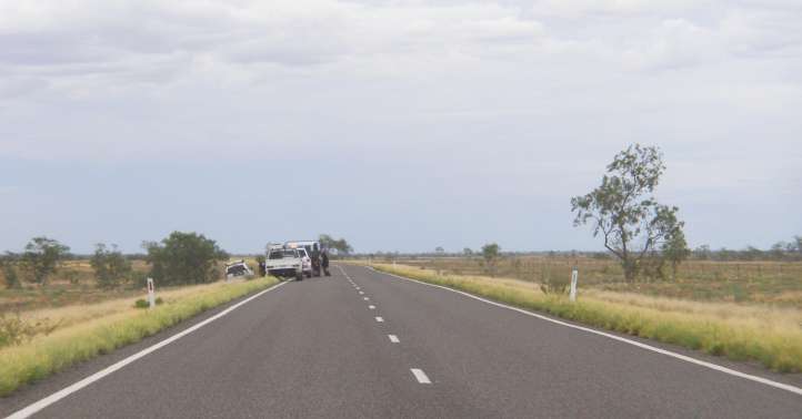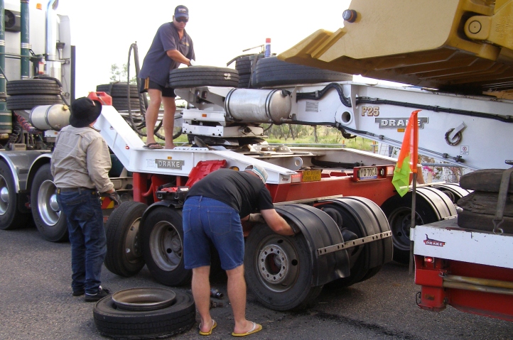 First problem. The flat tyre on the truck’s dolly tore off the cover over the wheels just out of Barcaldine.