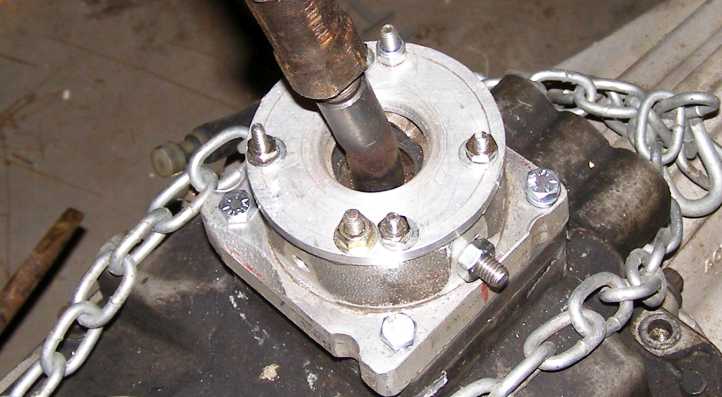 ...with the spacing between the three holes I needed set at the same as on the original holes on the gearbox extension housing. I’d drilled one at 10mm – the same as the original bolts – then one at 10.5mm – the size needed for tapping – and the third at 12mm, the size of the thread to be tapped. The bolt which I machined down was 10.5mm up to the thread.