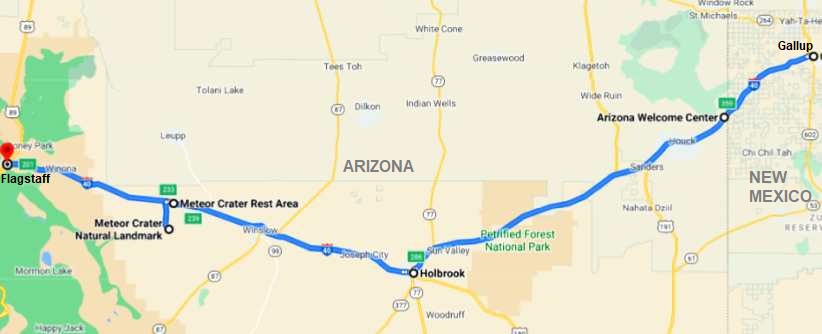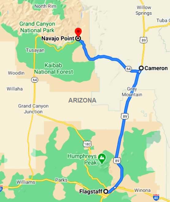...which climbs steeply out of Flagstaff and led us to Cameron, which is a settlement of somewhat rag-tag places apparently mostly for Indians. More jewellery and art on offer, we didn't stop. Here's the map of this stretch: