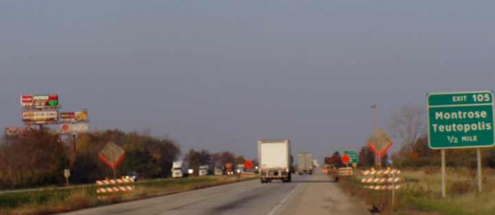 ...were to show (1) the colour of the roadworks signs; (2) the abundance of 'signs in the sky' for businesses waiting for us at exits like this one at Montrose, and (3) to show that the gas station signs have the prices up in coloured lights. The red is for petrol, I think it reads $3.79 a gallon, diesel is a bit over $4.00.