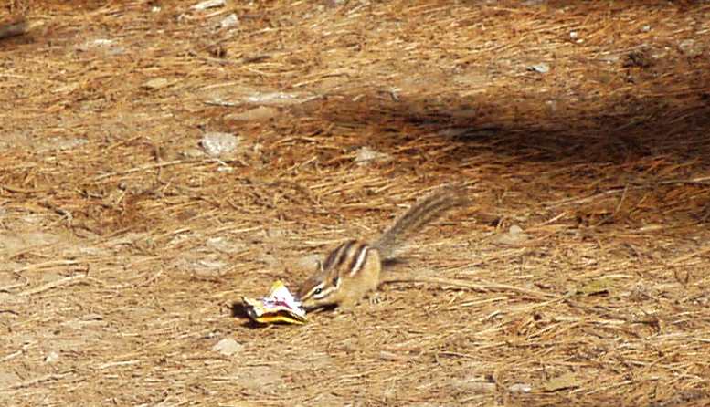 Cheeky chipmunk. This little fellow, almost oblivious of our presence, ran out and nibbled on something on the ground in a wrecking yard. They move very quickly!