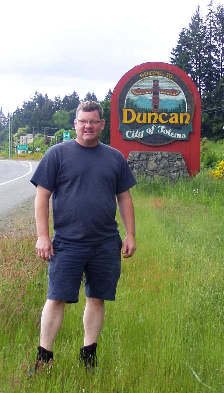 The first stop was Duncan. Jon's name is Duncan and he wanted a picture of himself alongside the town's identifying sign. He was readily accommodated: