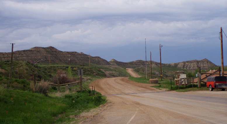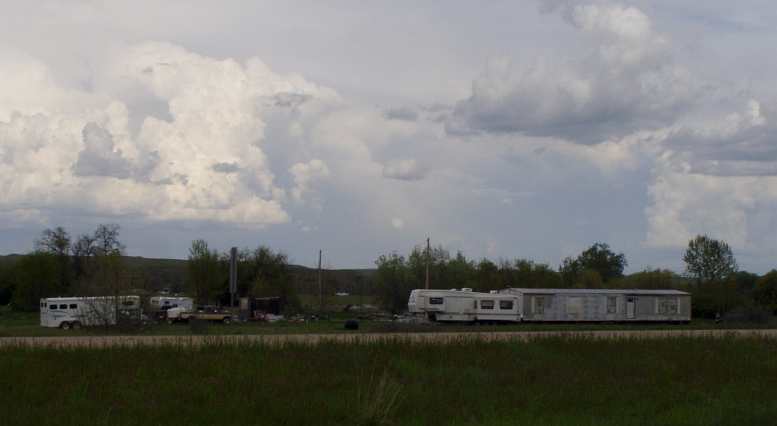 Indian country. This all led into Crow Indian country, the obvious change being an apparent lower standard of living and lots of housing. This yard has an abandoned pickup in it, laden with stuff, a fifth-wheeler that appears to be taking over from the house and other typical things like the horse float.