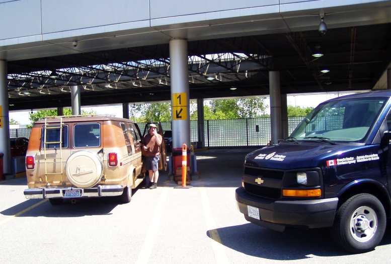 On leaving there, and after another quick clutch adjustment, we headed for the border. Refuelling as we went, using Jon's Costco card (at Burlington) to get a discount, we pulled up at the border crossing and went through the usual interrogation. Something must have made them suspicious or they felt it was time to do a random check, so we were sent inside to await a quick inspection of the van and its contents.