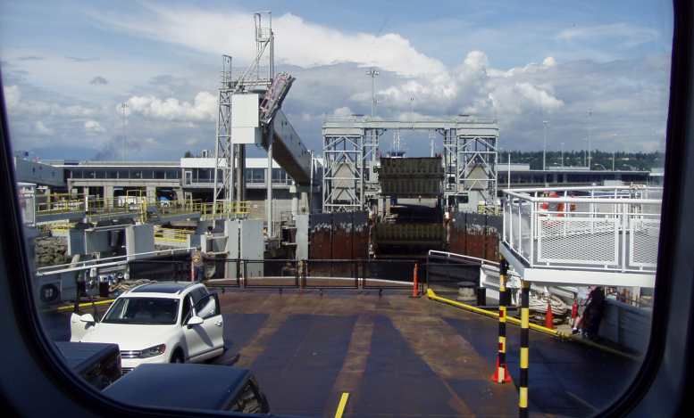 Departing the mainland. The cars visible here are the last of those driven onto the top car deck. We are just starting to get away from the dock.
