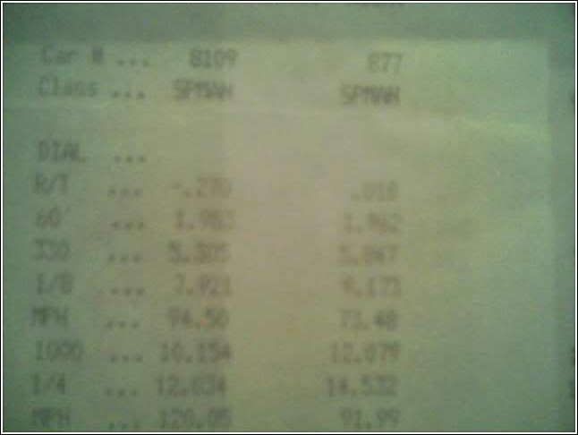Badstrat its alot easier to get traction on the takeoff with and SUV (mostly dew to weight) thats why I have such good 60ft times, its the rest of the 1260ft I have trouble with... (just look at my trap speed)...