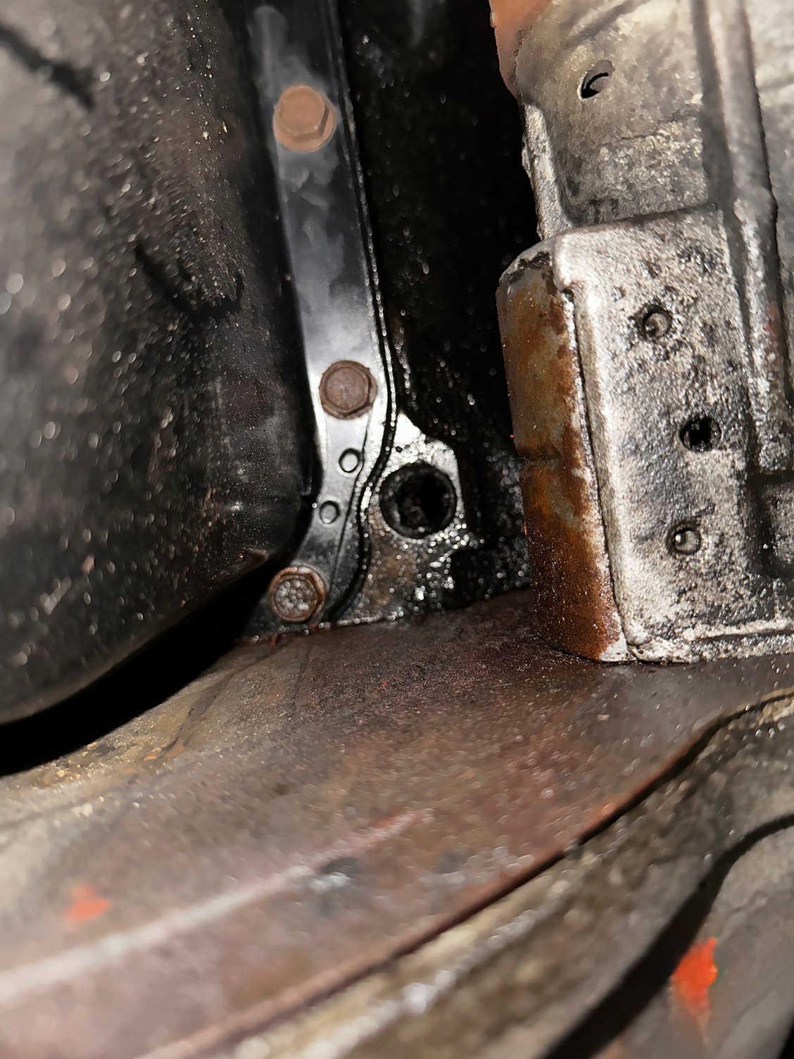 Help wanted!! I am new here and don’t know everything there is to know about how to work on these trucks. I just got the truck for a pretty good deal and it runs and drives. Not good but it drives. Shifts fine. My question is, can anyone please identify what this whole is next to my oil pan? It goes all the way through. It looks like oil is dumping from that area but I don’t know. Can somebody please help. I just noticed this today. While is on driver side of truck.